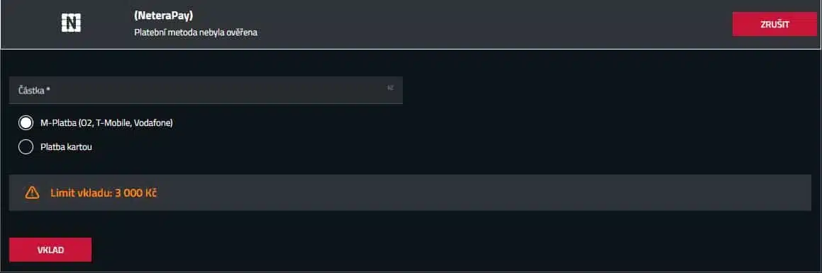 | SMS platba (NeteraPay) | od 100 Kč | do 500 Kč | okamžitě | vklad bez karty/banky |
